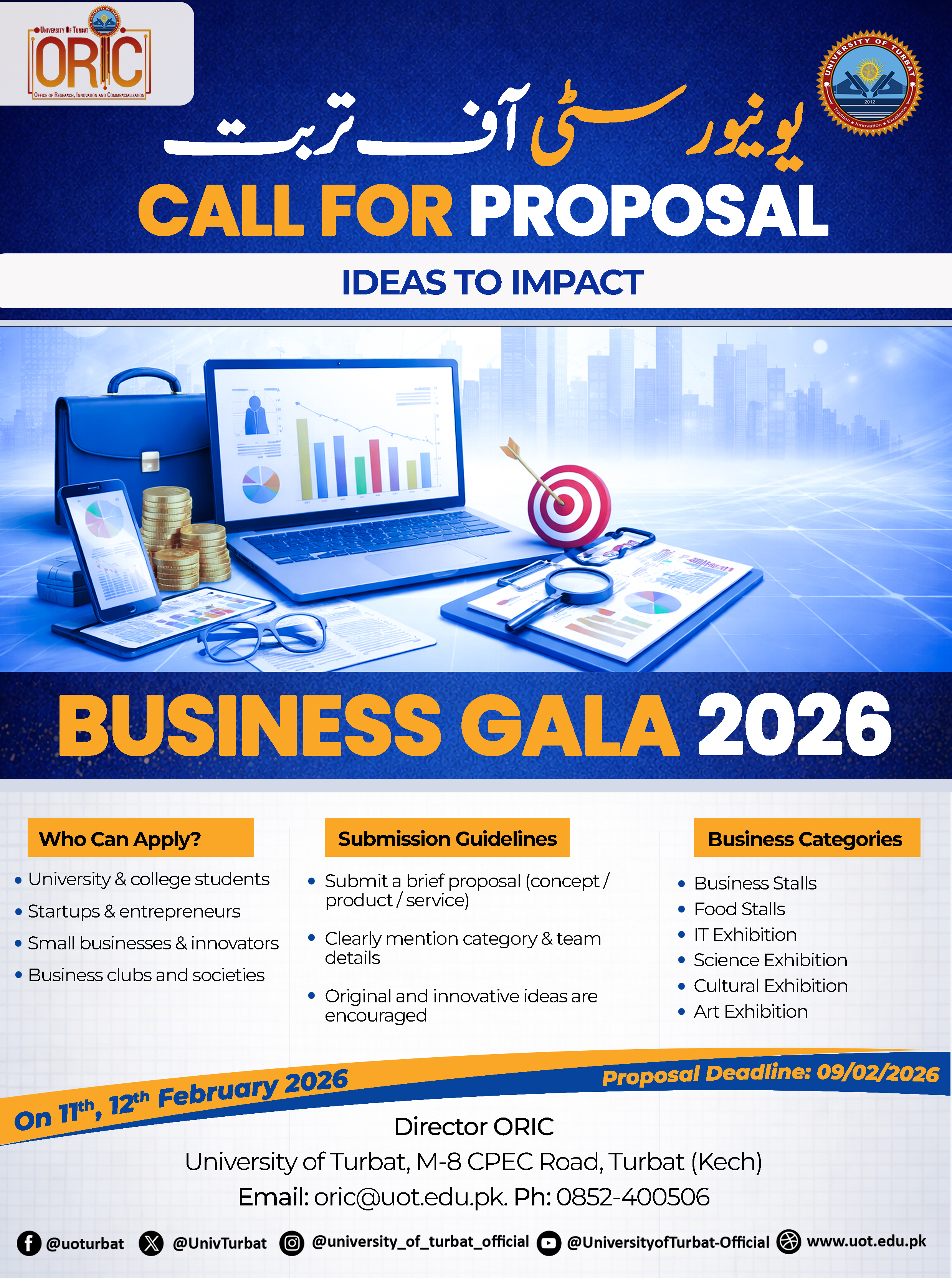 University of Turbat is the second General University in public sector, chartered by the Government of Balochistan vide Act 2012 passed by the Balochistan Provincial Assembly in May, 2012. The main objective of the establishment of the University of Turbat in the Mekran region in Balochistan is to provide better opportunities of higher education to the students of Turbat (Kech) and adjoining districts of Panjgur, Gwadar and Awaran. With the establishment of the University of Turbat, substantial number of students will be enrolled initially from different parts of province mainly from Mekran will have a direct effect on the social environment of the families of the students and indirectly to the society. With the introduction of market valued subjects, about 500 job opportunities annually would be created directly benefiting the social wellbeing of a segment of the population in the region.