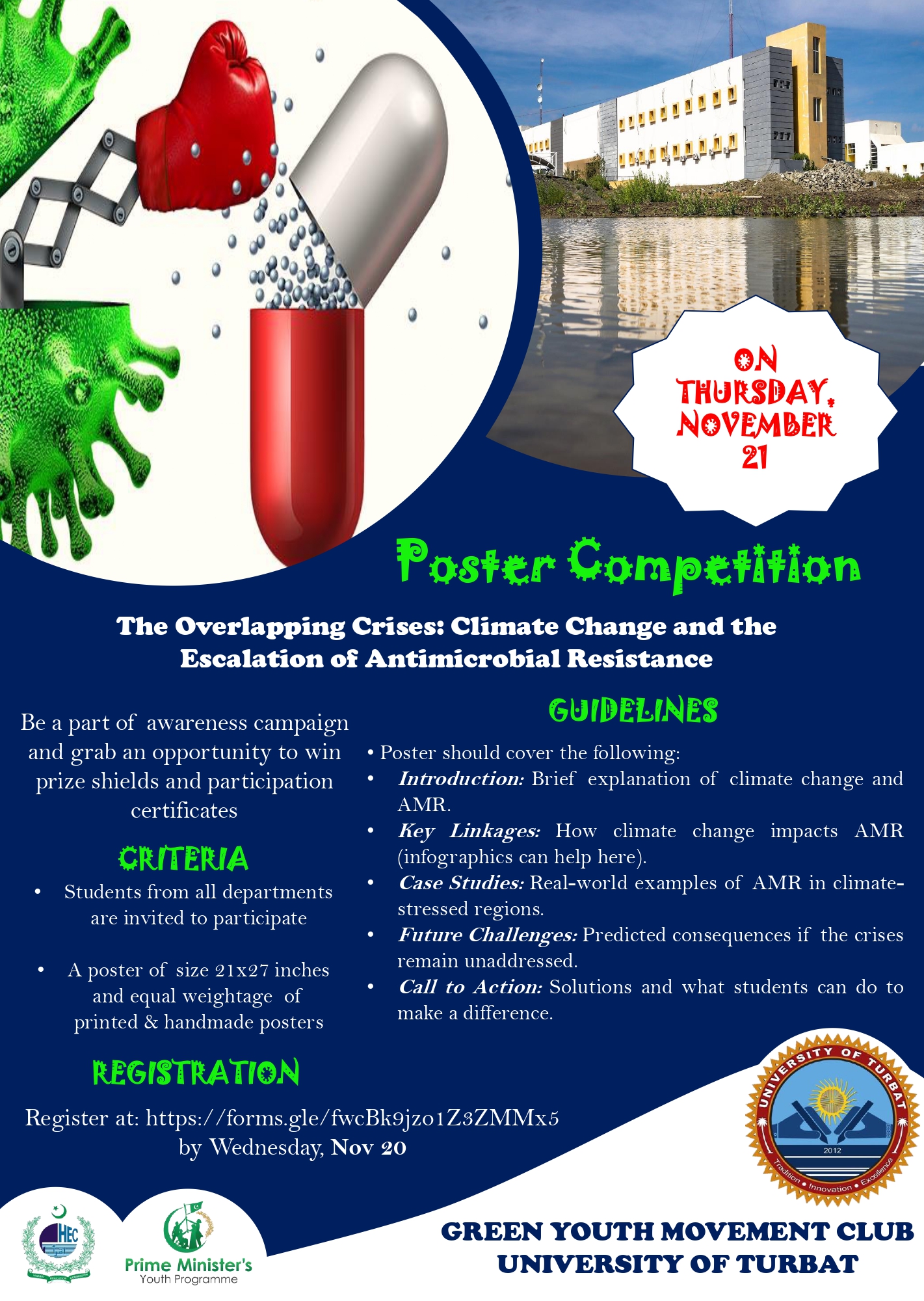 On the eve of World Antimicrobial Resistance Awareness Week (18-24 Nov-2024), the Green Youth Movement (GYM) Club University of Turbat (UoT) is conducting a poster competition on ‘‘The Overlapping Crises: Climate Change and the Escalation of the Antimicrobial Resistance’’.