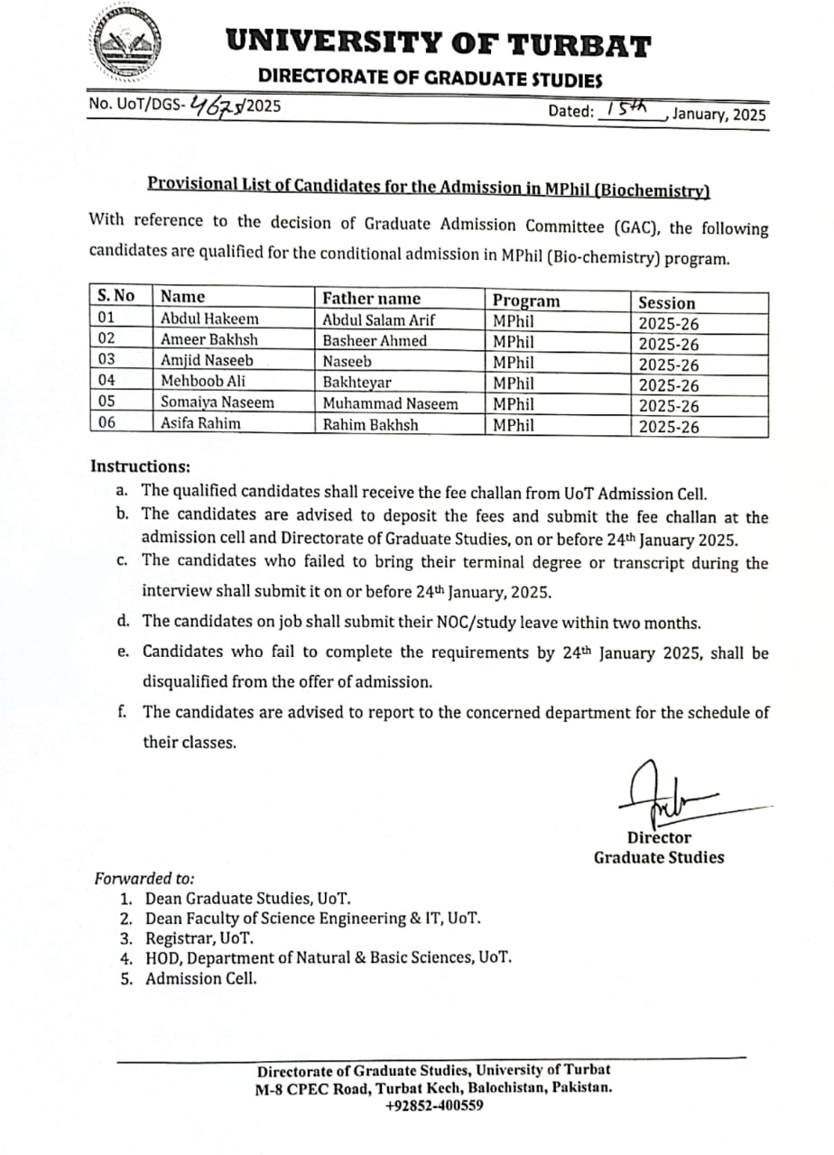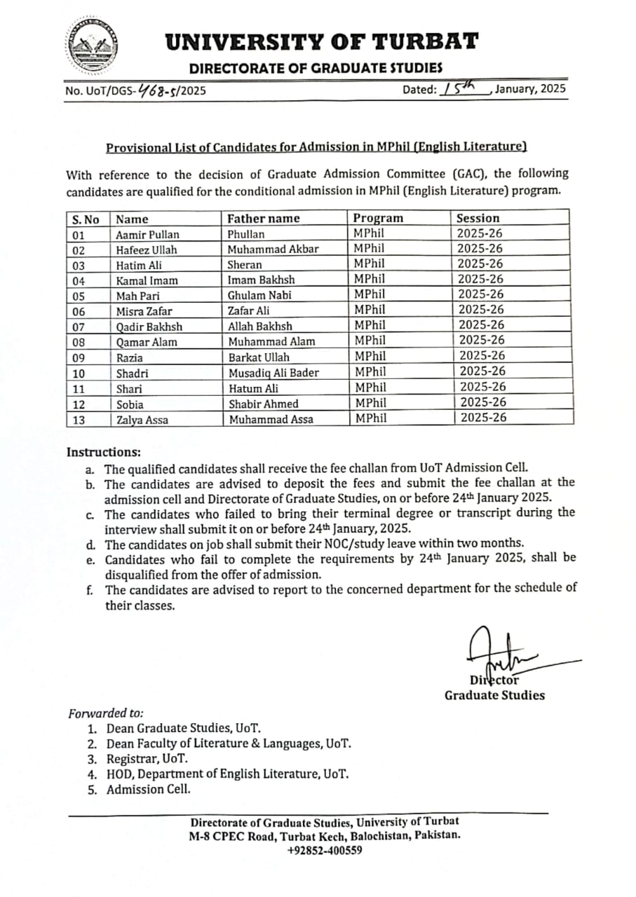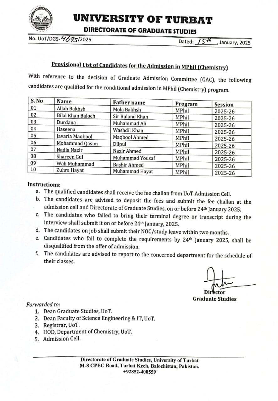 The University of Turbat (UoT) has announced the provisional merit lists for admission to its graduate programs, including MPhil Biochemistry, MPhil Chemistry, and MPhil English Literature, for the spring 2025 session. According to an announcement issued by the Directorate of Graduate Studies at UoT here on January 15, 2025, the Graduate Admission Committee (GAC) has finalized the list of candidates provisionally selected for admission to these graduate programs. The admissions are subject to the fulfillment of conditions outlined in the instructions column of the merit list.