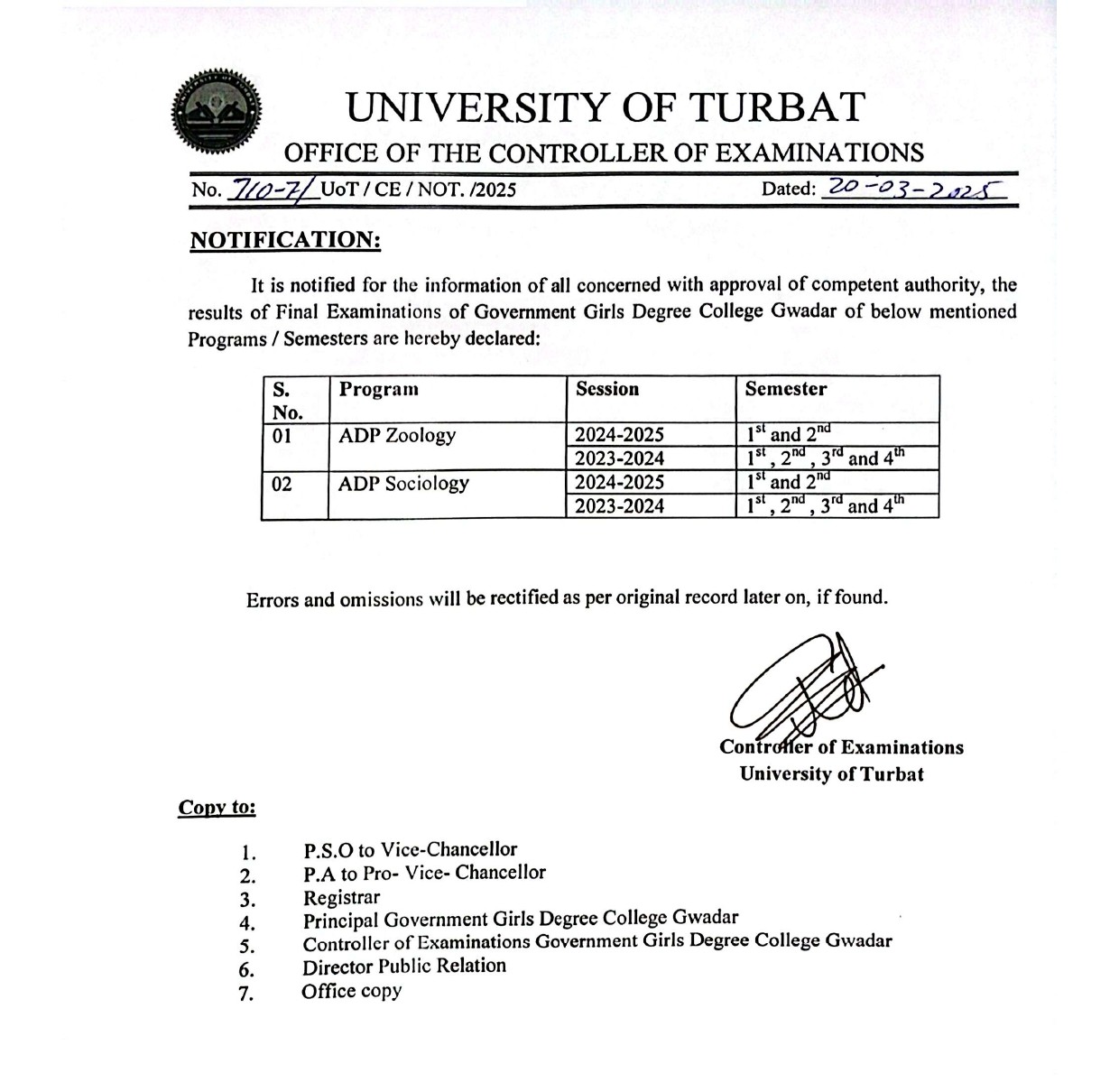 The University of Turbat (UoT) has announced the final examination results of the Associate Degree Program (ADP) in Zoology and Sociology of the Government Girls Degree College, Gwadar, for the following programs/semesters: