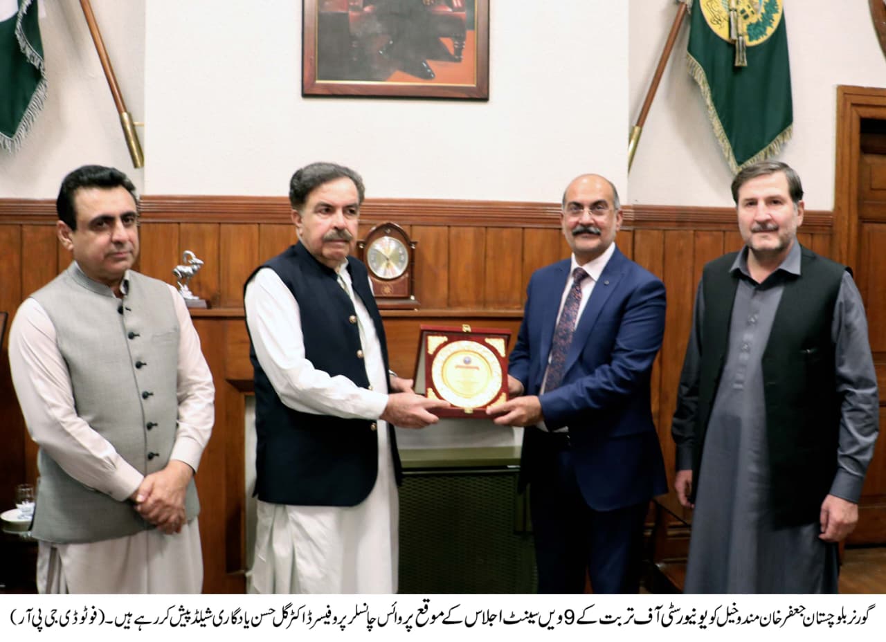 At the end of the meeting, Governor Jaffar Khan Mandokhail presented commemorative shields to the participants of the meeting. Provincial Secretary for Higher Education Saleh Baloch, Principal Secretary to the Governor Kaleem Ullah Babar, UoT Pro Vice Chancellor Dr. Mansoor Ahmed, HEC representative Dr. Zahoor Bazai, HEC Director General Dr. Nasir Shah, Additional Secretary Finance Department Arif Achakzai, UoT Registrar Gunguzar Baloch, and other Senate members were also present on the occasion.