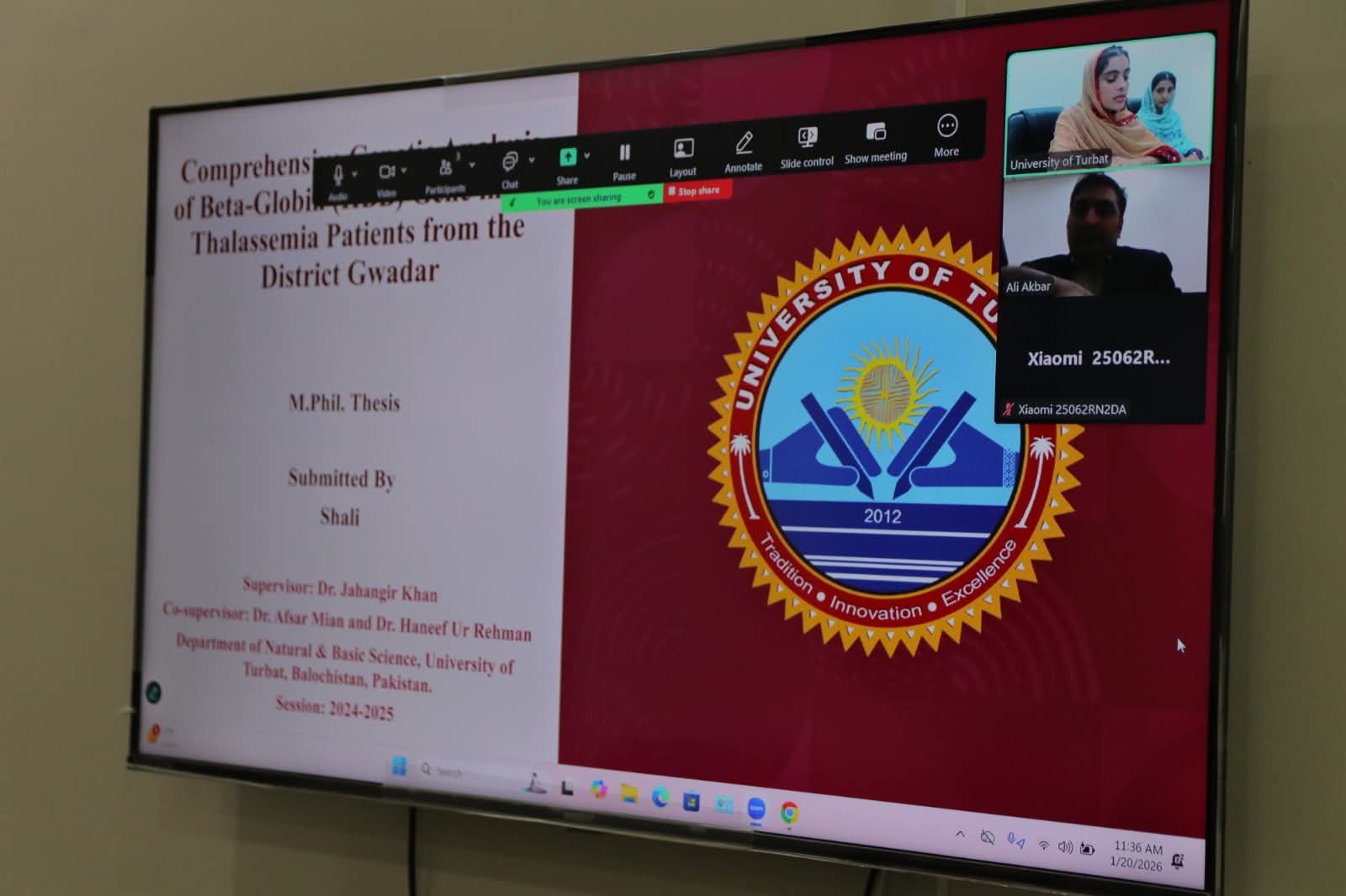 Ms. Shali Anwar and Ms. Zameera Wahid, two MPhil scholars from the Department of Natural and Basic Sciences at the University of Turbat (UoT), successfully defended their research theses on January 20, 2026. Their research work was conducted under the supervision of Dr. Jahangir Khan, Assistant Professor, UoT, and co-supervised by Dr. Afsar Mian, Associate Professor, Centre for Regenerative Medicine & Stem Cell Research, Aga Khan University, Karachi. and Dr. Haneef-ur-Rehman, Associate Professor, UoT.
