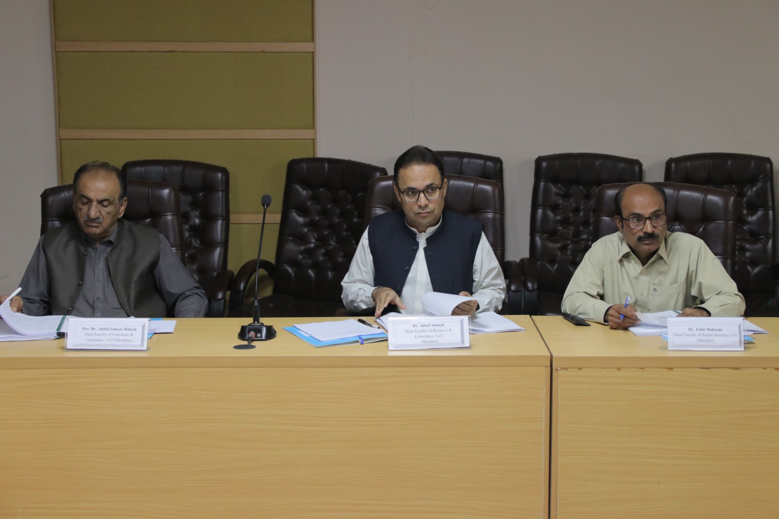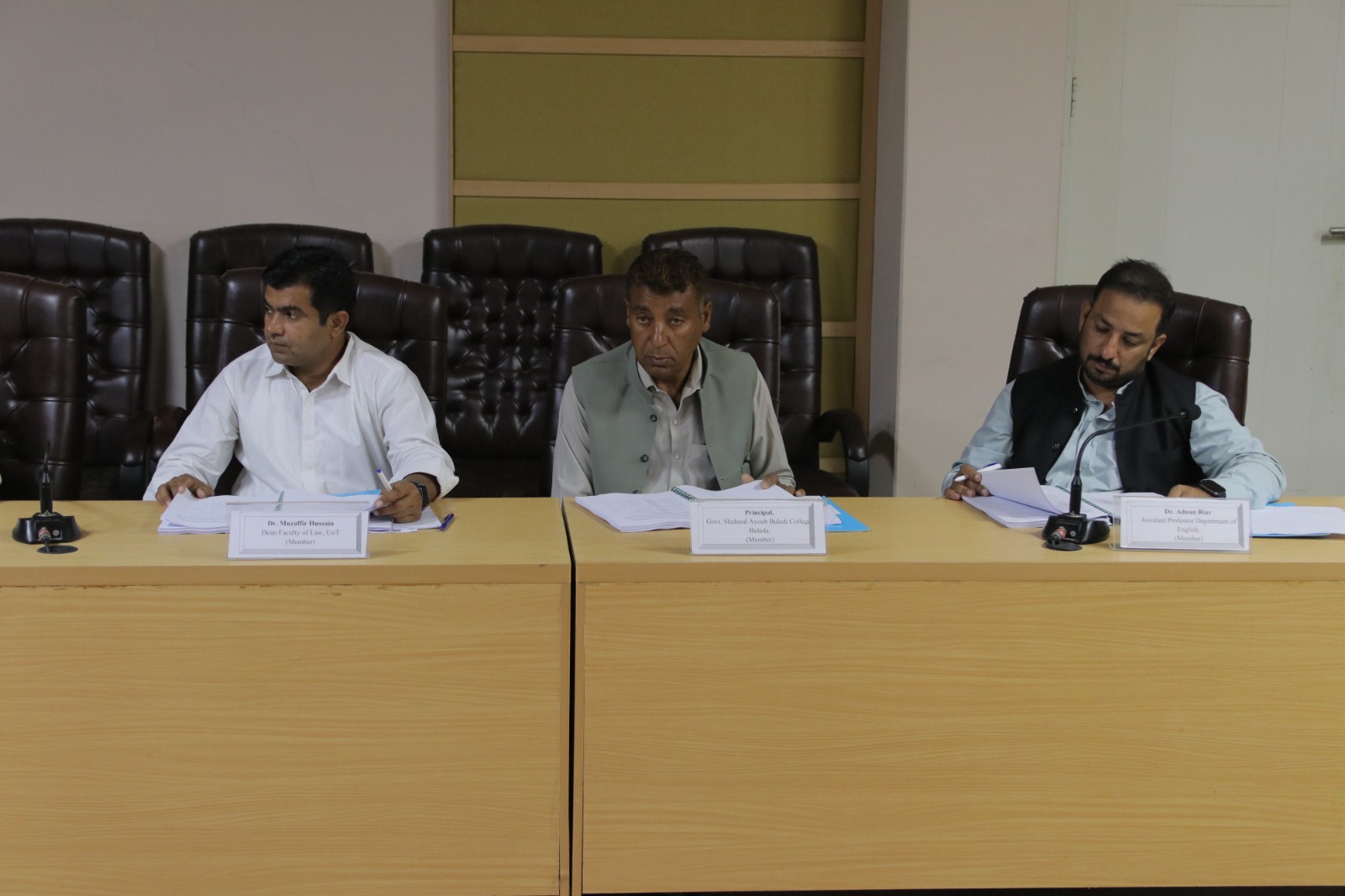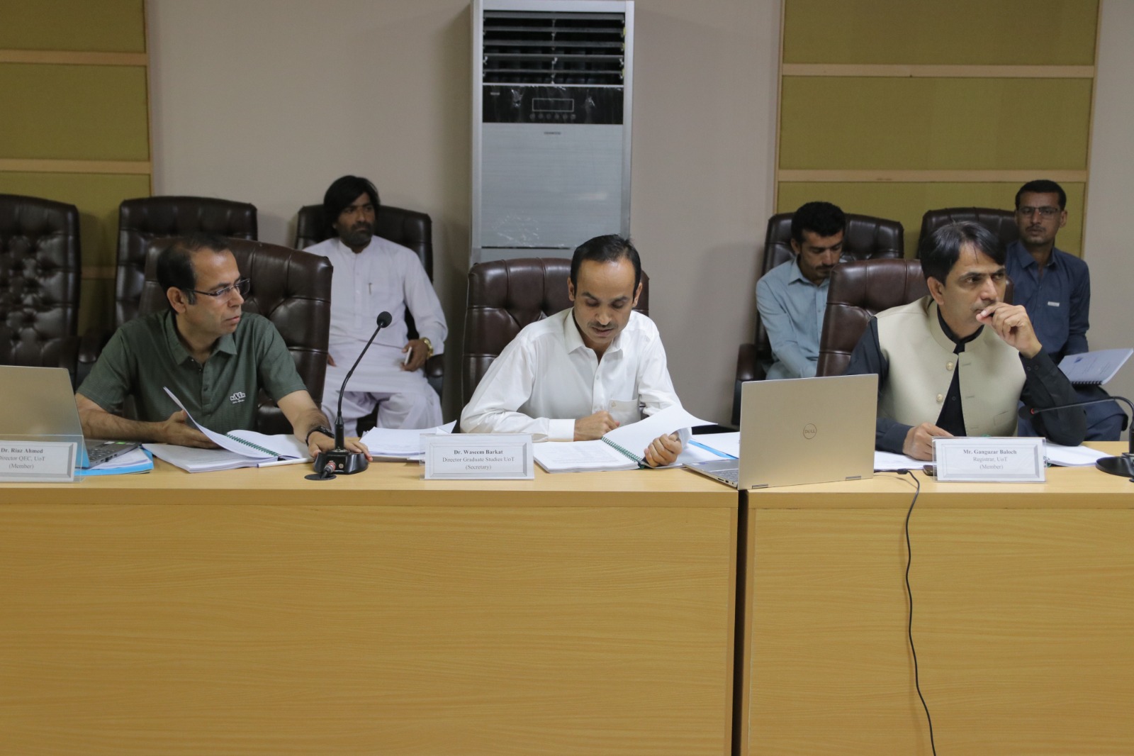 The meeting was attended by Prof. Dr. Abdul Saboor (TI), Dean, Faculty of Literature and Languages; Dr. Muhammad Tahir Hakeem, Dean, Faculty of Social Sciences, Dr. Muzaffir Hussain, Dean, Faculty of Law, Dean, Faculty of Business and Economics, Registrar Ganguzar Baloch, Dr. Waseem Barkat, Director, Graduate Studies Office, Dr. Riaz Ahmed, Director, Quality Enhancement Cell, Dr. Muhammad Yaseen, Director, Office of Research, Innovation and Commercialization, the Principal of Government Shaheed Ayoub Buledi College, Turbat, along with senior faculty members.