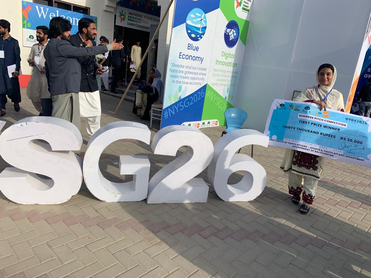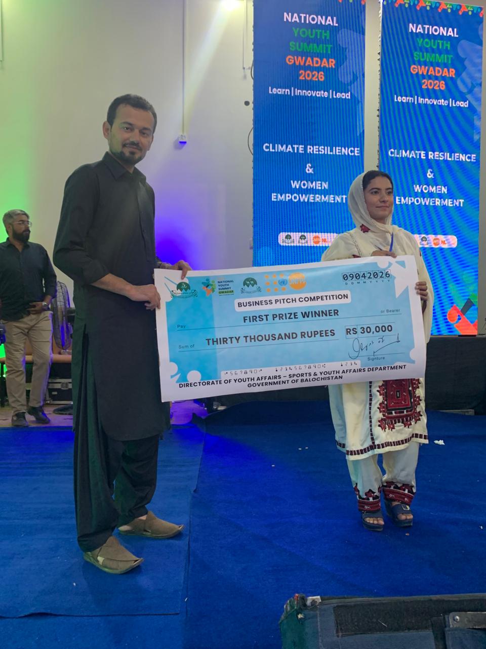 Ms. Fatima Nazeer, a talented student from the Law Department of the University of Turbat (UoT), secured first prize in the Business Pitch Competition at the National Youth Summit 2026, held in Gwadar from April 7 to 9, 2026. The summit, organized by the Government of Balochistan, brought together over 300 young delegates from across Pakistan who participated in various competitions and activities.