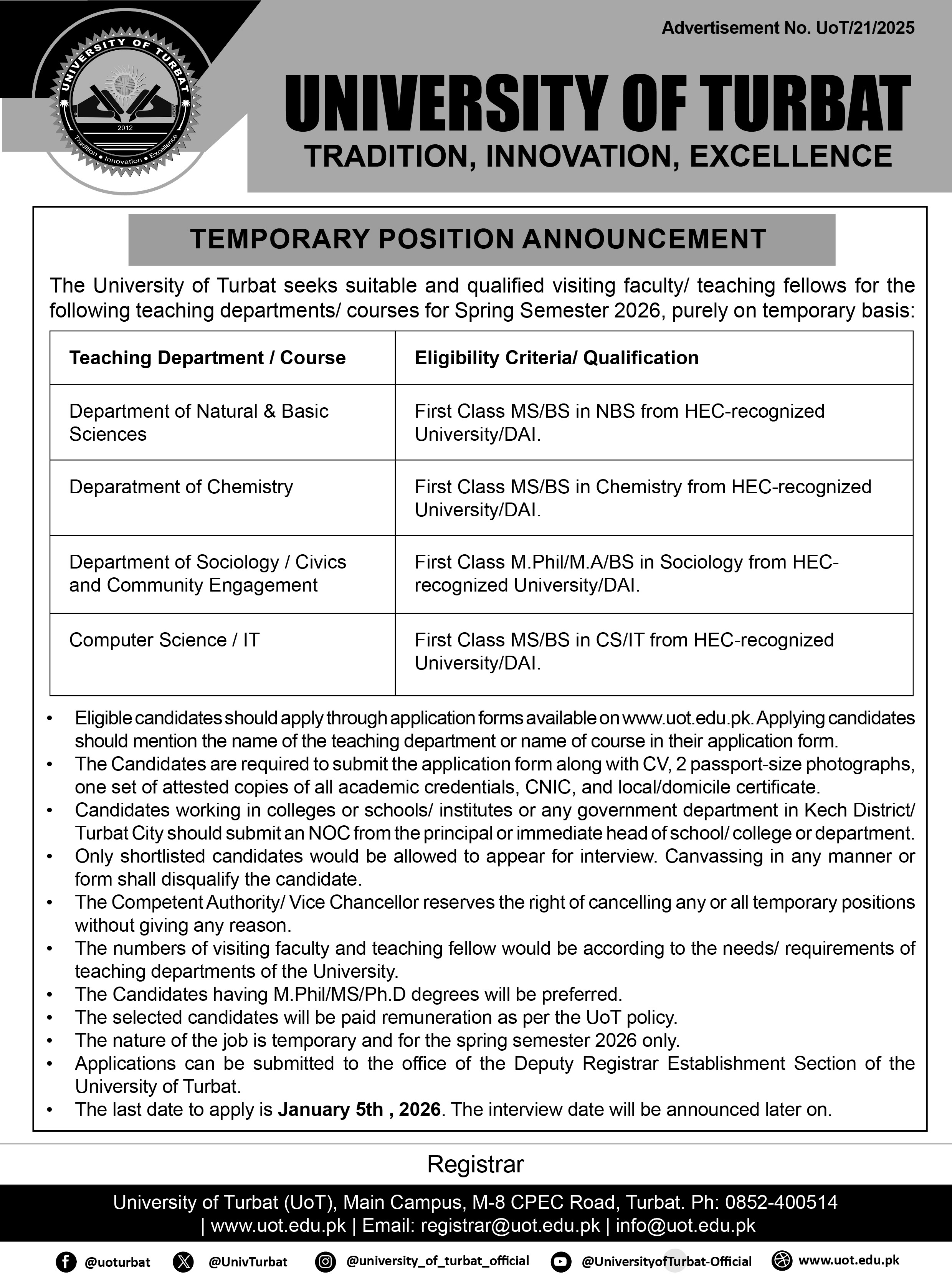 Teaching Fellow / Visiting Faculty Temporary Position for Spring 2026