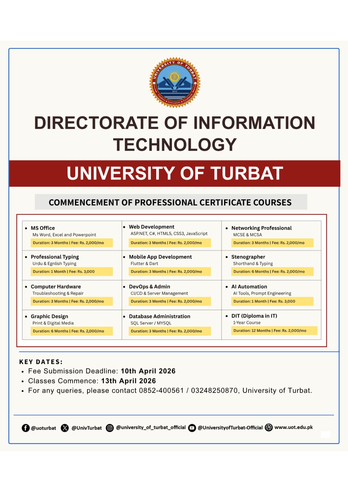 University of Turbat is the second General University in public sector, chartered by the Government of Balochistan vide Act 2012 passed by the Balochistan Provincial Assembly in May, 2012. The main objective of the establishment of the University of Turbat in the Mekran region in Balochistan is to provide better opportunities of higher education to the students of Turbat (Kech) and adjoining districts of Panjgur, Gwadar and Awaran. With the establishment of the University of Turbat, substantial number of students will be enrolled initially from different parts of province mainly from Mekran will have a direct effect on the social environment of the families of the students and indirectly to the society. With the introduction of market valued subjects, about 500 job opportunities annually would be created directly benefiting the social wellbeing of a segment of the population in the region.